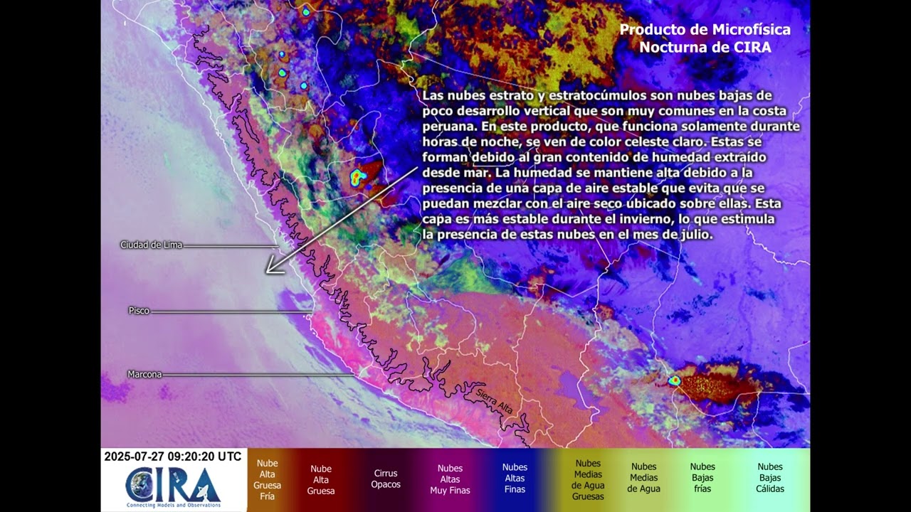 El producto de microfísica nocturna de CIRA es capaz de detectar estas nubes durante la noche. Estas aparecen con una coloración celeste o cyan, a diferencia de otros elementos de la imagen. En este caso podemos ver como toda la costa del departamento de Lima contiene nubes estrato, mientras gran parte de Ica contiene cielos despejados. Asimismo, la animación permite evaluar el movimiento de las nubes. Podemos ver que existe flujo rápido del sur frente a la costa de Ica, mientras en la costa de Lima el flujo del sur tiene menos velocidad.